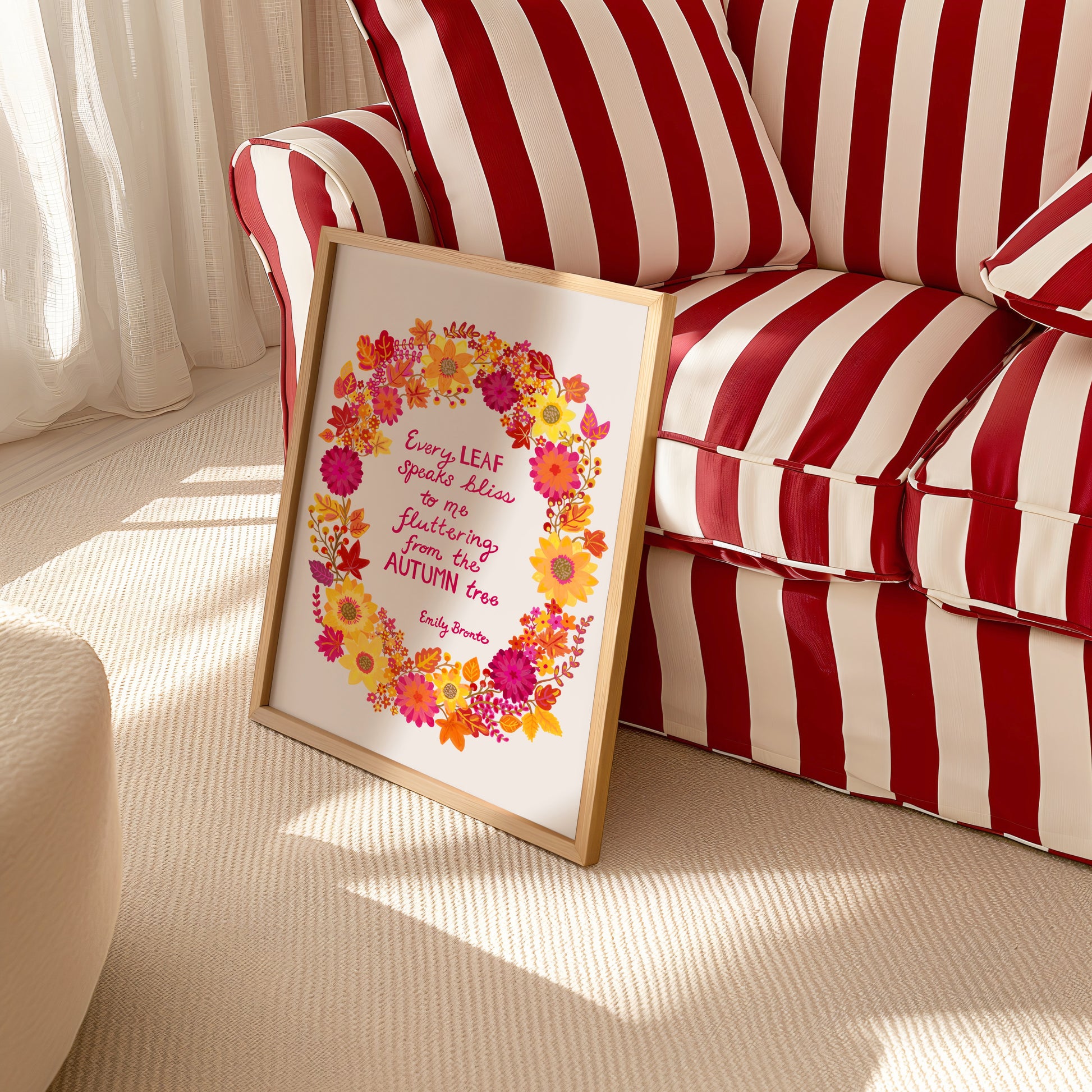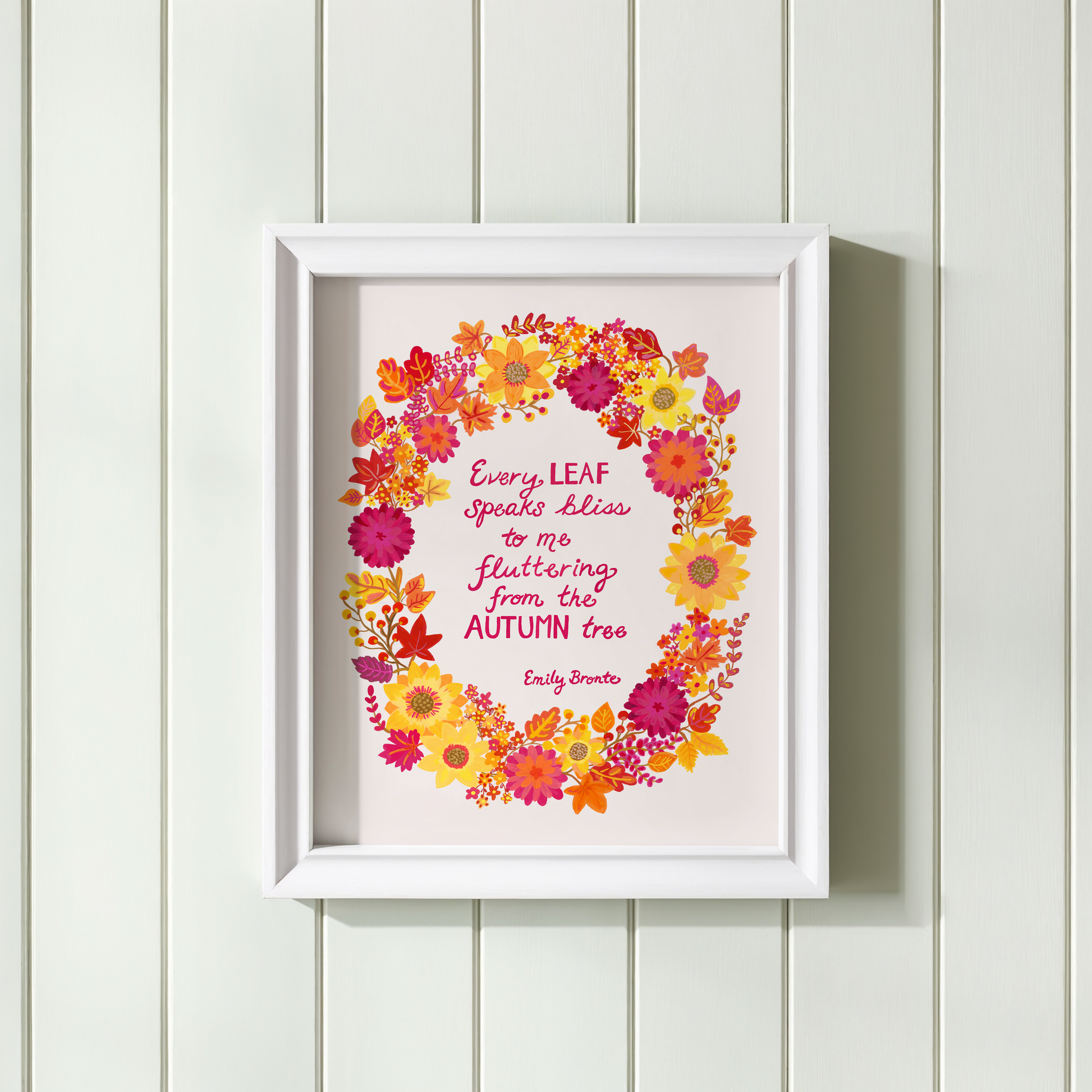 Featuring a lovely quote by Emily Bronte, this fall wreath celebrates the rich colors of the season in bright, bold tones. Looks great framed and set on a desk or end table!