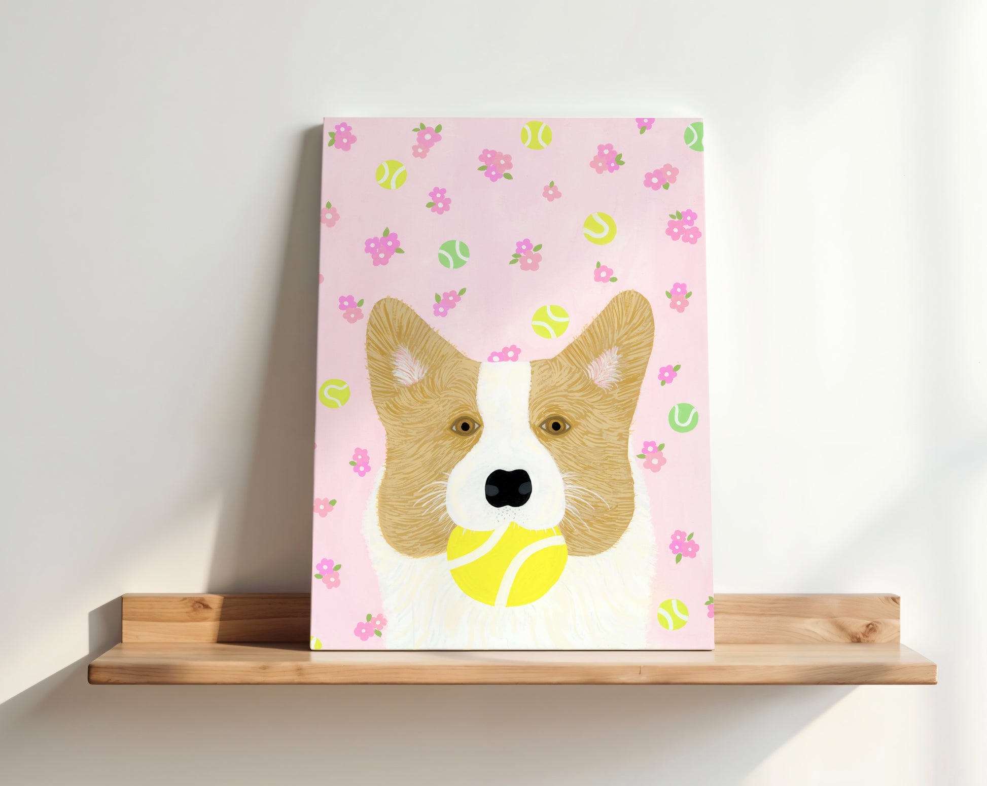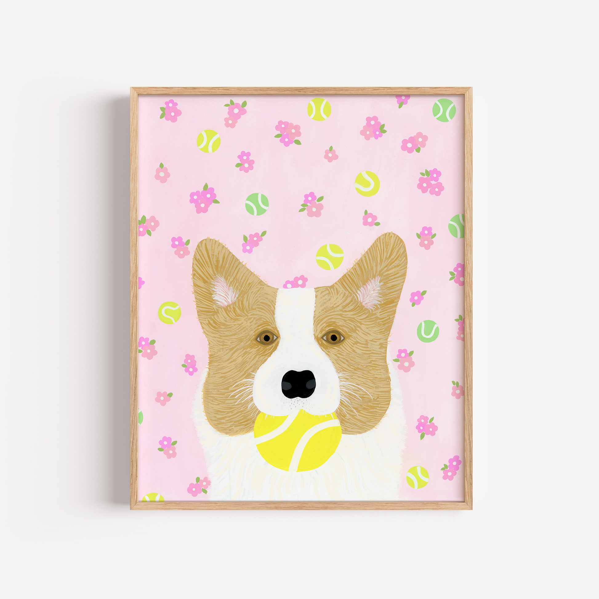 It's hard to resist a sweet pup carrying a tennis ball! This fun print with pink, tennis-themed wallpaper brings the perfect amount of happy doggie energy to your space. A great gift for dog lovers!